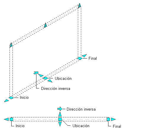 En la ilustración siguiente se muestran los pinzamientos de inicio, fin, invertir dirección y ubicación que aparecen para un segmento de muro recto en las vistas 2D y 3D.