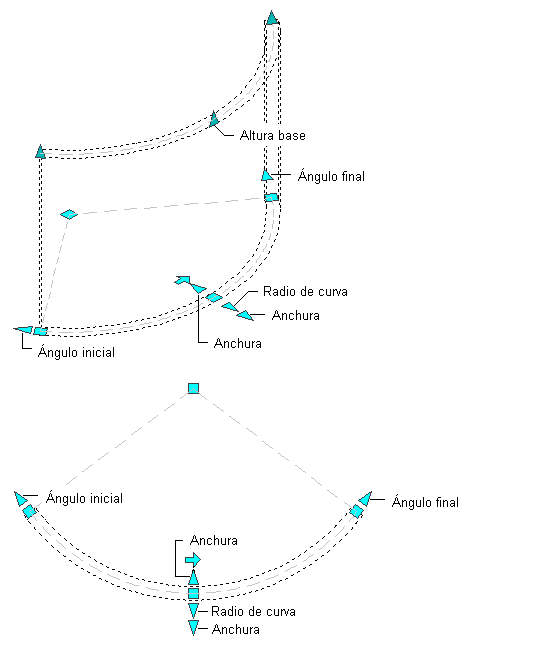 En la ilustración siguiente se muestran los pinzamientos de ángulo inicial, ángulo final, anchura, radio de curva y altura base que aparecen para un segmento de muro curvo en las vistas 2D y 3D.