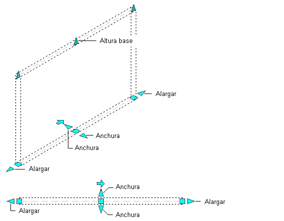 En la ilustración siguiente se muestran los pinzamientos de longitud, anchura y altura base que aparecen para un segmento de muro recto en las vistas 2D y 3D.