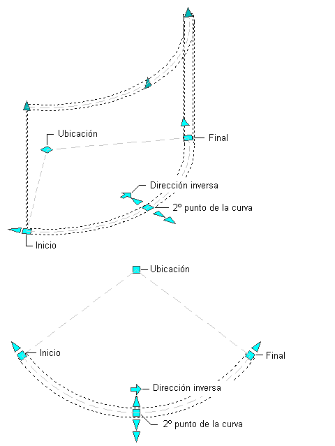 En la ilustración siguiente se muestran los pinzamientos de inicio, fin, invertir dirección, segundo punto de curva y ubicación que aparecen para un segmento de muro curvo en las vistas 2D y 3D.