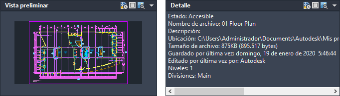 Con la opción Panel Vista preliminar/Detalles seleccionada, puede alternar los modos pulsando (Vista preliminar) para obtener una vista preliminar o (Detalle) para ver una descripción del archivo de dibujo seleccionado.