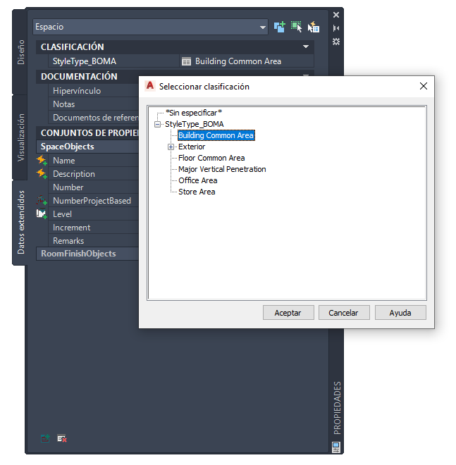 Si ha generado un espacio con los contornos calculados por una norma de cálculo de área, es posible que deba clasificar el espacio de acuerdo con la norma seleccionada, con el fin de proporcionar a la norma la información necesaria para calcular los contornos. Por ejemplo, la norma BOMA requiere la clasificación de los espacios de acuerdo con su tipo de espacio, ya que el tipo de espacio es importante para determinar los desfases de contorno.