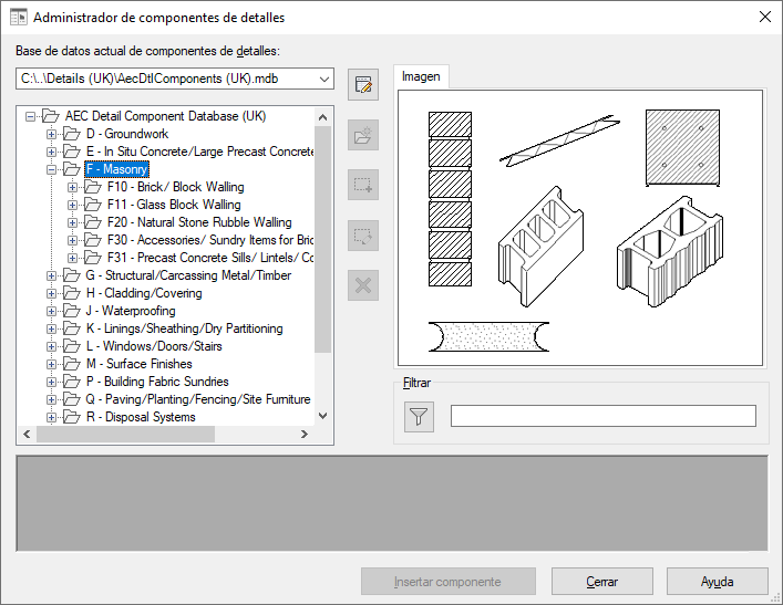 Al utilizar el cuadro de diálogo Administrador de componentes de detalles, se puede navegar entre diferentes bases de datos de componentes de detalles. Mediante una vista en forma de árbol jerárquico y una función de filtro se facilita la acción de localizar componentes individuales dentro de la base de datos. Una vez que encuentre el componente que necesita, puede insertarlo en un dibujo, o puede arrastrarlo y colocarlo en una paleta de herramientas para su uso repetido. Los cinco botones que aparecen verticalmente en la parte central del cuadro de diálogo no estarán disponibles a menos que se tengan derechos de edición para la base de datos seleccionada.