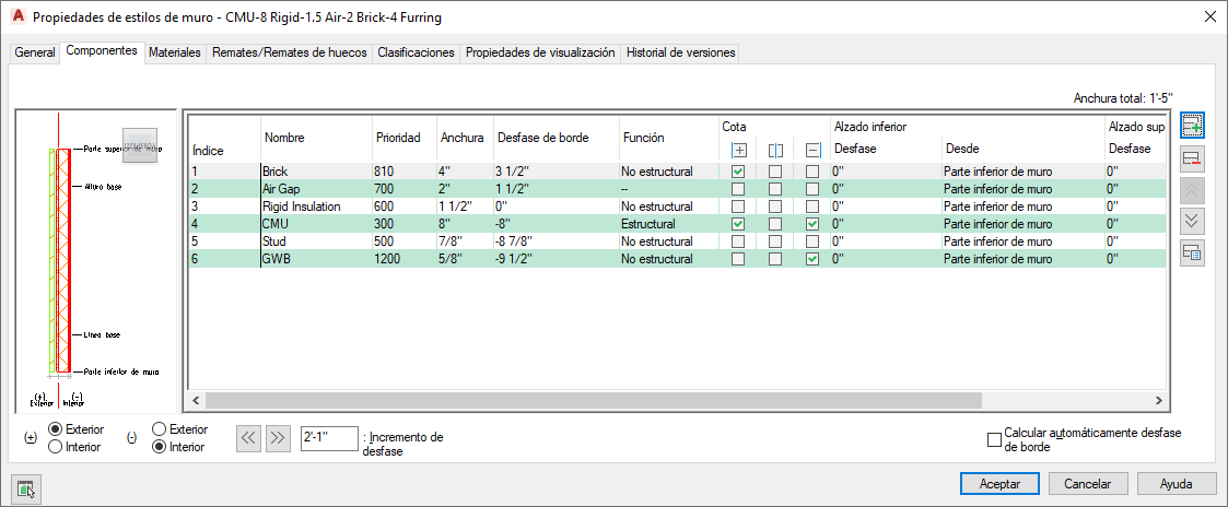 La ficha Componentes del cuadro de diálogo Estilos de muro permite ver los componentes de muro a medida que se especifican.