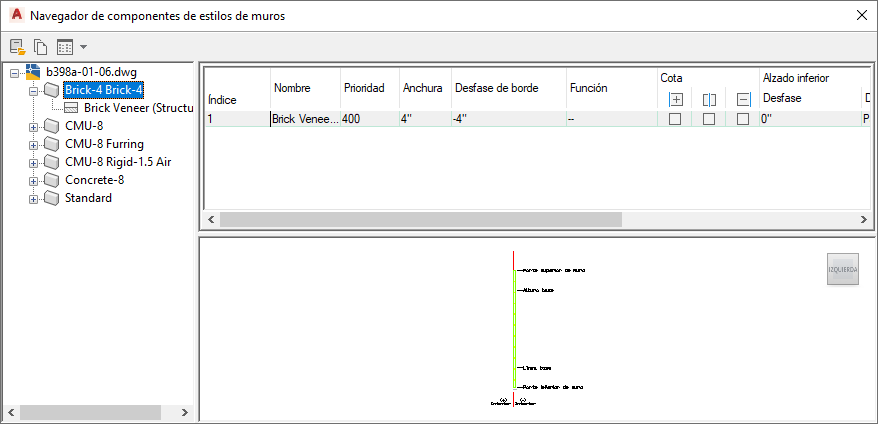 El Navegador de componentes de estilos de muros es una herramienta que permite ver y copiar componentes de otros estilos de muro en el dibujo actual y en otros dibujos. Puede copiar componentes de estos estilos al estilo de muro actual. Una vez agregados al estilo de muro, puede cambiar sus propiedades según sea necesario para el estilo que está editando.