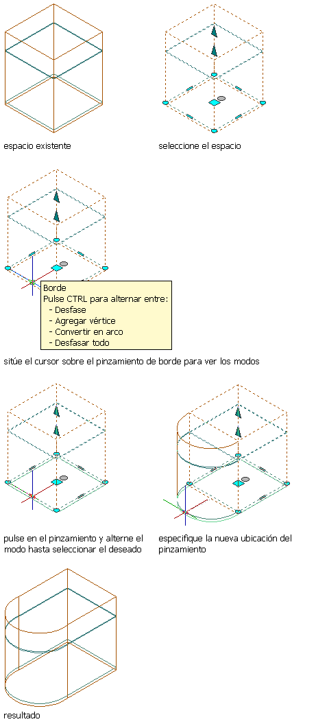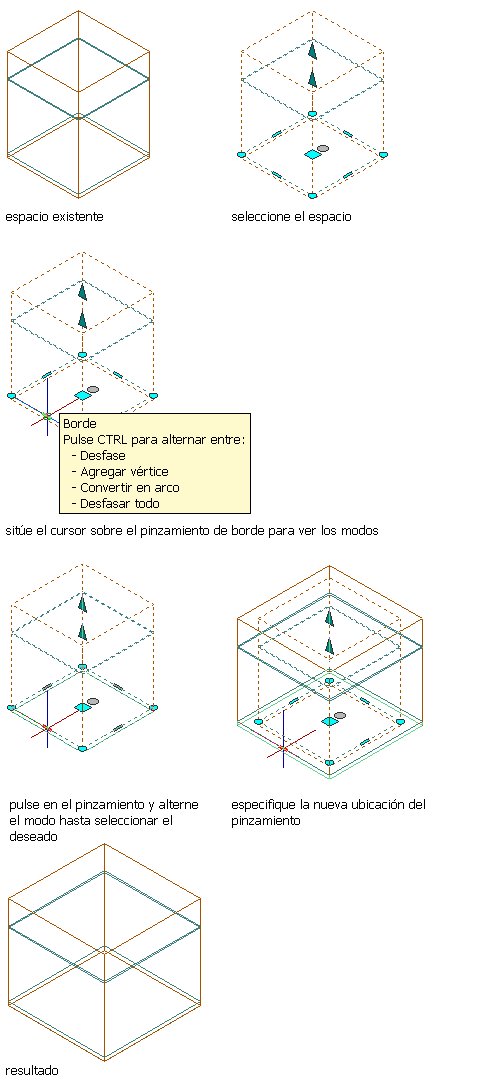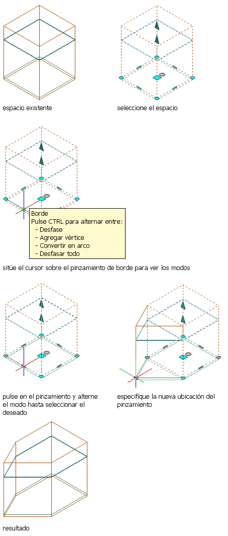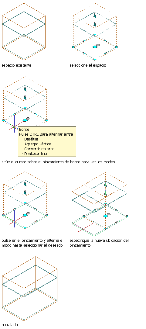 - Desfasar todo: utilice esta opción para mover todos los bordes de un contorno de espacio a una distancia idéntica. Al arrastrar un borde, los demás se colocan en la posición correspondiente. Esta opción es muy útil para operaciones de cambio de tamaño habituales, como el cambio de escala de un contorno de espacio.