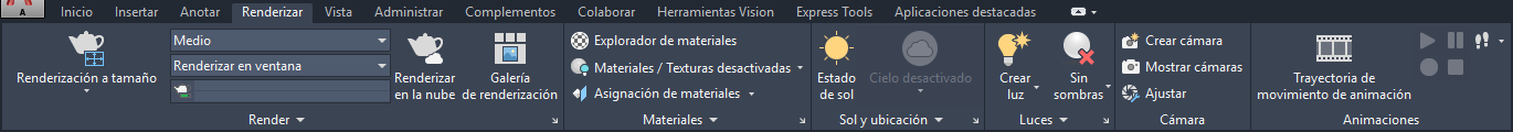 La ficha Render contiene todos los comandos que necesita para trabajar con la renderización, los materiales, las luces, las cámaras y las animaciones.