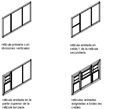 Puede continuar anidando rejillas para crear varios niveles. Por ejemplo, en las ilustraciones siguientes se muestra la rejilla del estilo del conjunto de puerta y ventana Estándar, la misma rejilla con una rejilla anidada en una celda de la rejilla secundaria y otra vez la misma rejilla con rejillas anidadas en todas las celdas de la rejilla secundaria.