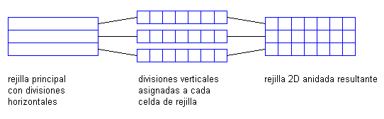 Para anidar rejillas se empieza por una rejilla principal. Después, las celdas de la rejilla principal se rellenan con otra rejilla. Por ejemplo, la siguiente ilustración tiene una rejilla principal horizontal con cuatro celdas. Puede anidar una rejilla vertical en cada celda horizontal para crear una rejilla en 2D sencilla.