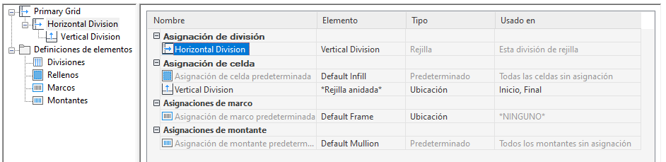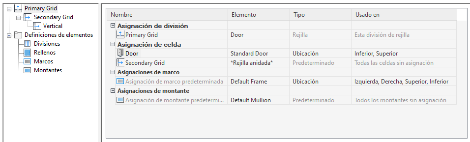 Puede definir rejillas anidadas en la ficha Reglas de diseño del cuadro de diálogo Propiedades de conjunto de puerta y ventana. El árbol de la izquierda de la ficha muestra las rejillas. Siempre existe una sola rejilla principal, que puede tener una o varias rejillas secundarias. Cada rejilla secundaria puede tener una o varias rejillas terciarias, y así sucesivamente.