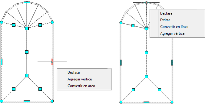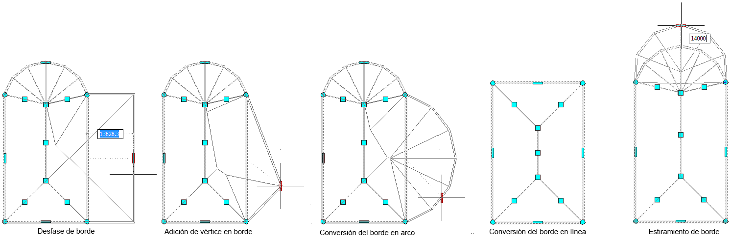 El pinzamiento de borde presenta cinco modos de edición: Desfasar, Agregar vértice, Convertir en arco, Convertir en línea y Estirar.