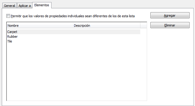 - Seleccione Permitir que los valores de propiedades individuales sean diferentes de los de esta lista si desea que otros valores distintos de los especificados aquí puedan aparecer en la paleta Propiedades.