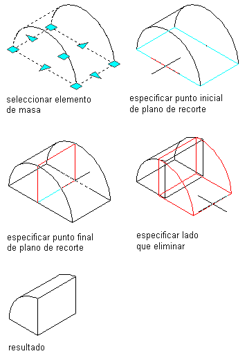 Utilice este procedimiento para recortar un elemento de masa. El plano de división especificado actúa como línea de recorte y se determina el lado del elemento de masa que va a eliminarse.