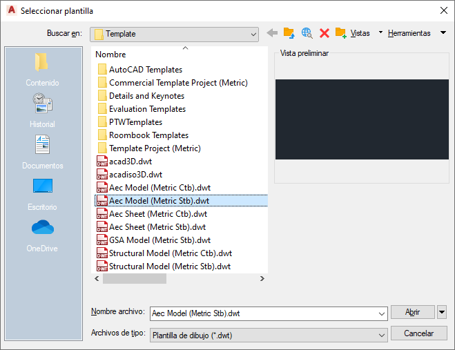 Las plantillas de dibujo que se proporcionan con el software se encuentran en C:\ProgramData\Autodesk\ACA <version>\esp\Template. Los archivos de plantilla tienen la extensión DWT.
