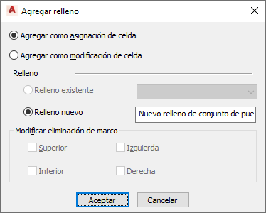 Agregar como modificación de celda y desea insertar una puerta o ventana de un estilo distinto del que contiene el dibujo sin quitar el borde del marco del objeto seleccione Relleno nuevo, especifique un nombre para el objeto y elija Aceptar.