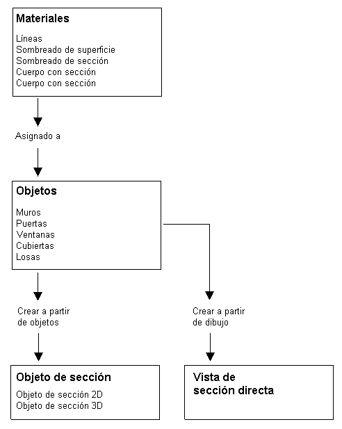 Los objetos de sección 2D y 3D constan de varios componentes de visualización que pueden estar determinados por los materiales.