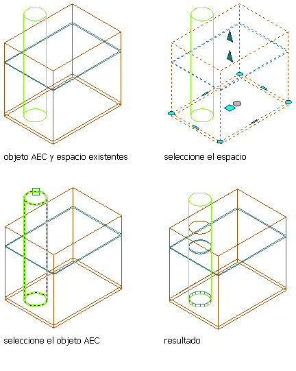 Siga este procedimiento para colocar objetos, como elementos de masa, en un espacio con el fin de crear huecos o recortes personalizados. Por ejemplo, una estructura de rejilla de pilar puede tener pilares dentro del espacio. Una vez definidos como condiciones de interferencia, los pilares recortan un área en el suelo y en el techo del espacio.