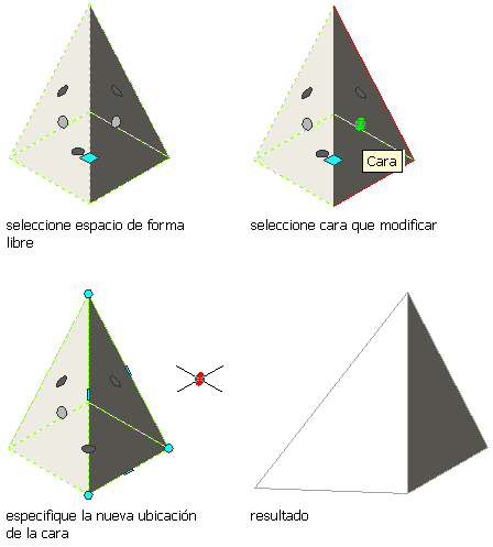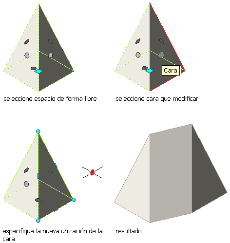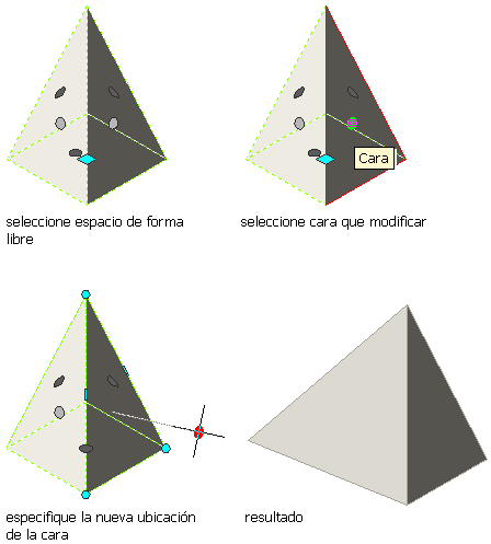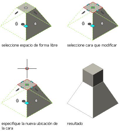 | mover la superficie de espacio libremente mientras se estiran las superficies adyacentes | Mantenga pulsado el pinzamiento de superficie, pulse Ctrl una vez y especifique la nueva ubicación. |