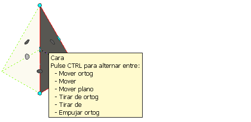 | tirar de la superficie de espacio o empujarla ortogonalmente mientras se agregan superficies adyacentes o se crea un agujero | Mantenga pulsado el pinzamiento de superficie, pulse Ctrl cinco veces y especifique la nueva ubicación. Empuje hacia el espacio para crear un agujero, o tire hacia afuera de éste para agregar caras adyacentes. |