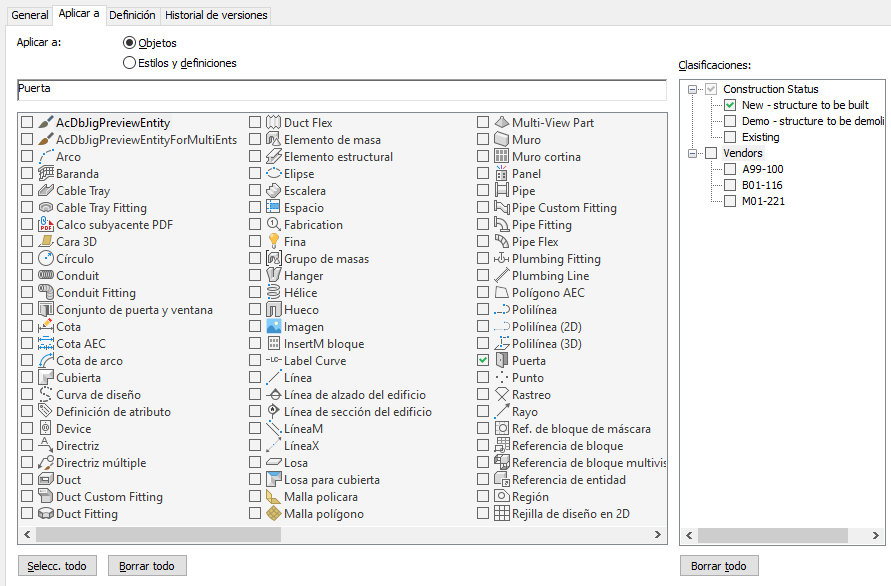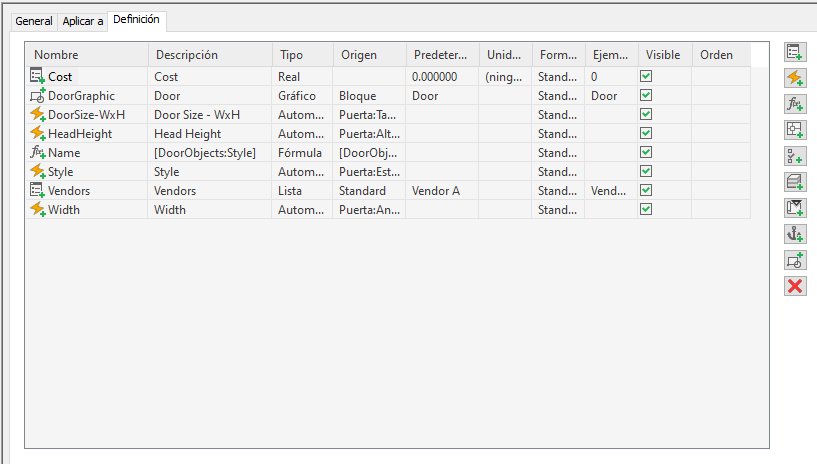 Definición de conjunto de propiedades aplicable a objetos de puerta