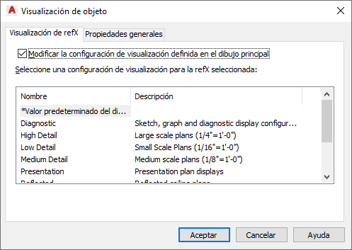 La lista de configuraciones de visualización muestra las disponibles en el dibujo de referencias externas. Seleccione Valor predeterminado del dibujo si desea utilizar la configuración de visualización predeterminada especificada en el dibujo principal.