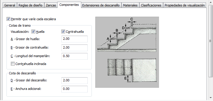 Nota: Si se activa Permitir que varíe cada escalera, los cambios realizados en esta ficha no afectan a escaleras existentes. Para que estas escaleras tengan los parámetros de estilo, seleccione la escalera, muestre sus propiedades, muestre la hoja de trabajo Componentes y elija Restablecer valores de estilo.