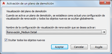 Al alternar entre los distintos tipos de planos de renovación, puede trabajar en diferentes "vistas" del dibujo; de este modo, se evitan los errores que normalmente ocasiona la edición de varios dibujos. Los parámetros de visualización del tipo de plano de demolición se encuentran en el cuadro de diálogo Opciones de renovación. De modo predeterminado, se asigna el color amarillo a los objetos demolidos.