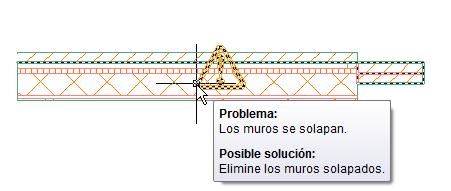 La interacción de los objetos de un dibujo de Conjunto de herramientas AutoCAD Architecture 2027 depende de varias reglas que dictan el modo en que se colocan los objetos en relación unos con otros. Si el software identifica un problema en la colocación de los objetos o sus componentes, aparece un consejo para identificar la ubicación del problema, tal como se muestra.