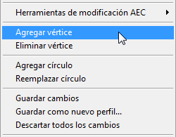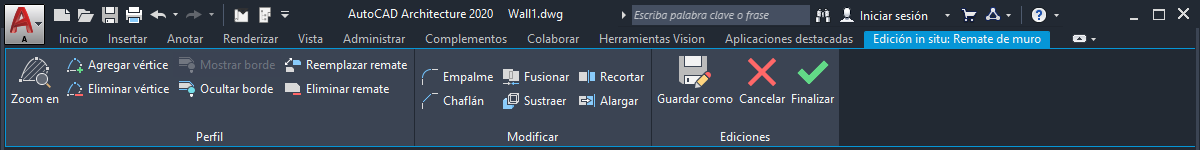 La edición in situ es un modo de edición especial en el que puede editar los componentes de objetos basados en perfiles o polilíneas directamente en la pantalla, pero en el que otras funciones de edición están limitadas. Por ejemplo, en el modo de edición in situ puede cambiar un remate de muro, pero no puede guardar ni cerrar el dibujo. Al cerrar el modo de edición in situ, puede decidir si desea descartar los cambios, sobrescribir la definición de componente existente o guardar dichos cambios como una nueva definición.