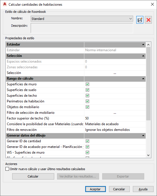- En Estilo de cálculo de Roombook, puede guardar diferentes cálculos de Roombook. Esto permite definir y almacenar distintos cálculos en el dibujo. El valor por defecto es el estilo "Estándar". Al guardar con un nombre diferente, puede definir diferentes cálculos (diferentes espacios, zonas, rangos de cálculo, etc.) que se almacenan en el dibujo. Escriba una descripción de sus necesidades.