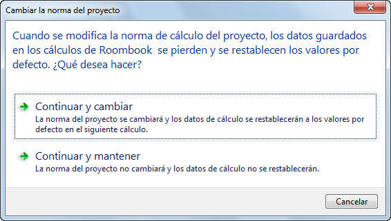 - Cancele con No cuando no desee cambiar la norma, sino conservar la anterior. Todos los cálculos realizados previamente con Roombook y los ajustes manuales permanecen sin cambios.