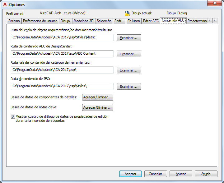 Especificación de las opciones predeterminadas de contenido AEC para el dibujo actual