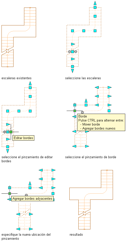 Nota: Si cambia la anchura de la escalera tras haber editado un lado con pinzamientos, los cambios realizados con los pinzamientos se perderán.