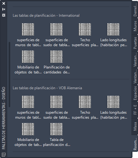 La paleta de herramientas Roombook contiene las distintas tablas de planificación según la norma de cálculo actual. Los comandos están vinculados al archivo