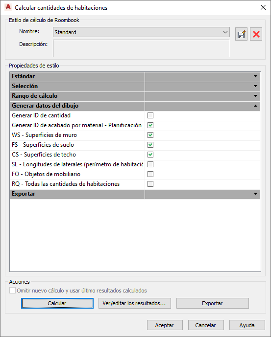 - En el cuadro de diálogo Calcular cantidades de habitaciones, en Propiedades de estilo, lista Generar datos del dibujo, seleccione Generar ID de acabado por material.