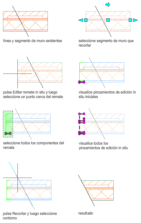 Siga este procedimiento para modificar un remate de muro recortando un componente. Un contorno de recorte puede ser una línea, un arco, un círculo, una polilínea o el borde de un componente de muro.