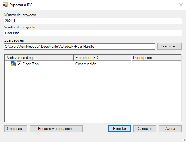 - En Nombre de proyecto, si es necesario, modifique el nombre. Por defecto, se muestra el nombre del dibujo que se va a exportar.