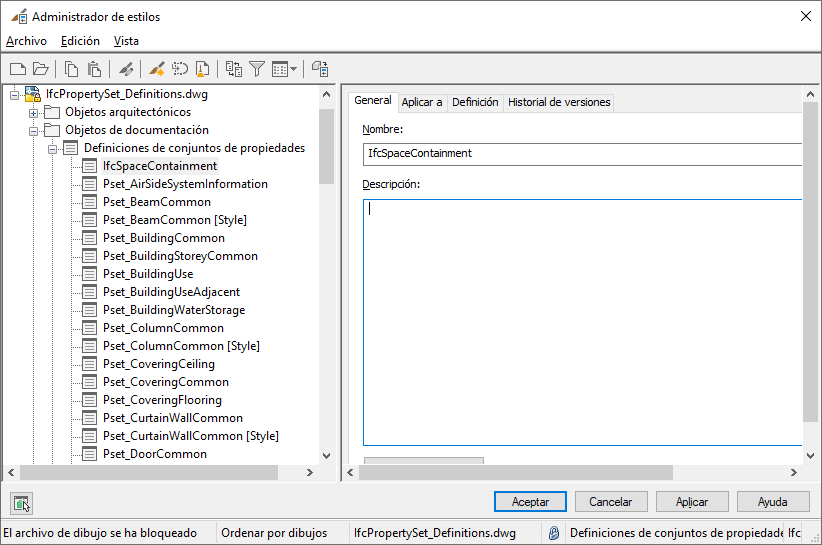 - Vaya a C:\ProgramData\Autodesk\ACA <version>\esp\Styles y abra IfcPropertySet_Definitions.dwg.