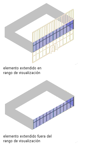 Si por un nivel transcurre un elemento extendido, por ejemplo un muro cortina o un hueco de ascensores, querrá mostrar sólo las partes del elemento que se encuentran en dicho nivel. Puede crear una vista de modelo delimitada que presente sólo los objetos y rangos de objeto situados dentro de un rango de visualización especificado por el usuario.