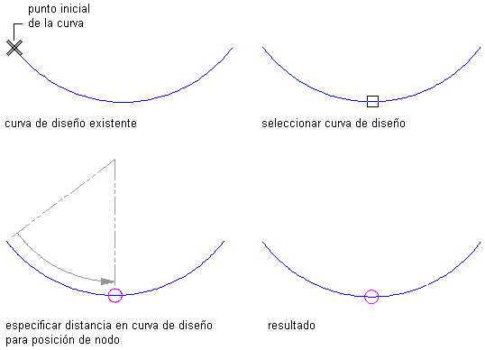 | Colocar nodos en las ubicaciones que especifique | pulse Intro. Escriba el número de nodos y especifique la ubicación de los nodos seleccionándolos o introduciendo distancias desde el punto de inicio de la curva. |