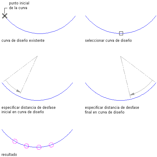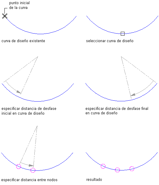 | Repetir nodos a intervalos fijos a lo largo de la curva | escriba r (Repetir). Especifique los desfases inicial y final del primer y último nodo, así como la distancia entre los nodos. |