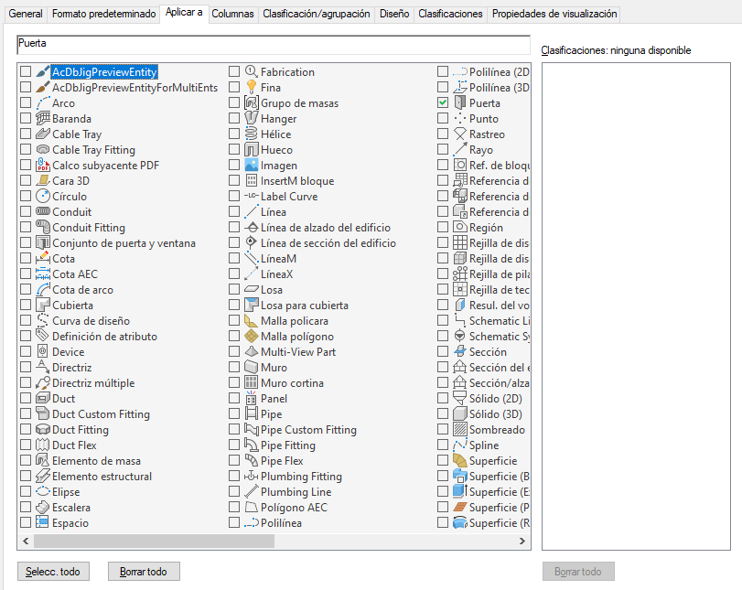 En el panel de la derecha figuran todas las definiciones de clasificación que se aplican a cualquiera de los tipos de objeto seleccionados. Puede seleccionar varias clasificaciones en distintas definiciones de clasificaciones. Si se seleccionan clasificaciones, las tablas de planificación de este estilo pueden incluir objetos seleccionados en la izquierda únicamente si se han clasificado con las clasificaciones seleccionadas.