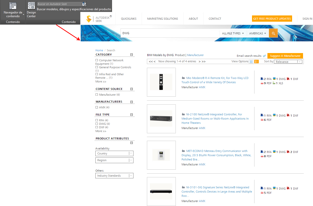Puede utilizar Autodesk Seek para buscar información de diseño de productos. Muchos proveedores de contenido, tanto socios empresariales como contribuidores individuales, publican en Autodesk Seek. El contenido incluye modelos 3D, dibujos 2D, especificaciones, folletos y otras descripciones de productos o componentes.