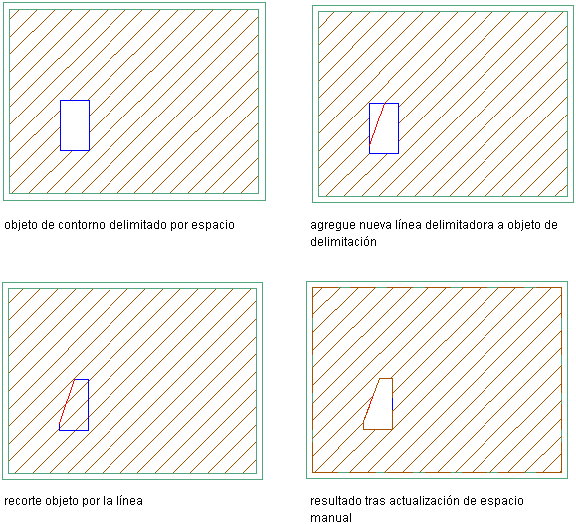 Al recortar un objeto de contorno sustituyendo un nuevo objeto de contorno en la posición de recorte, el nuevo objeto no se reconocerá automáticamente como objeto de contorno para el espacio, dado que no delimitaba el espacio previamente. En este caso, debe actualizar manualmente el espacio para que reconozca el nuevo objeto de contorno. Vea el ejemplo siguiente: