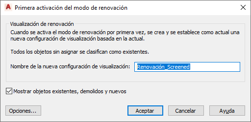 Se abrirá el cuadro de diálogo Primera activación del modo de renovación y, de modo predeterminado, se asignará un nombre a la nueva configuración de visualización con el prefijo Renovation.