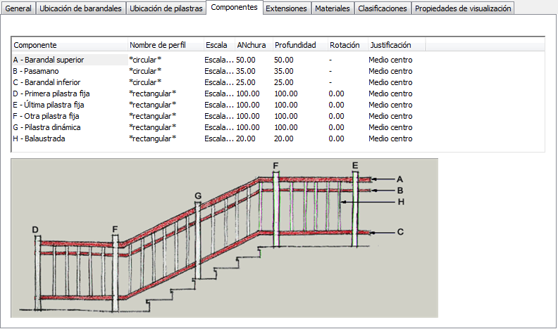 Utilice este procedimiento para especificar la forma de los componentes de la baranda y la anchura, profundidad y rotación de los componentes de cada estilo de baranda.