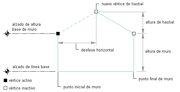 Utilice este procedimiento para agregar hastiales a la línea de cubierta de los muros. También puede agregar un hastial en la hoja de trabajo Línea de cubierta/suelo de la paleta Propiedades.