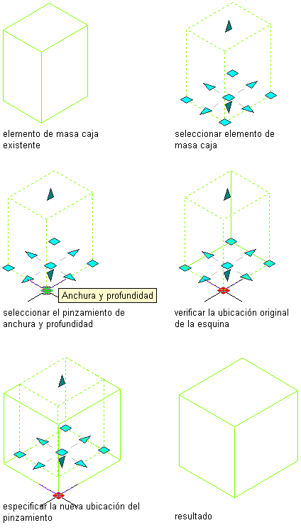 Utilice este procedimiento para cambiar el área de un elemento de masa rectangular mediante pinzamientos. Un elemento de masa rectangular es cualquier elemento con cuatro líneas en su base, como un arco, una bóveda de cañón, una caja, un hastial, una pirámide, un triángulo isósceles o un triángulo rectángulo.
