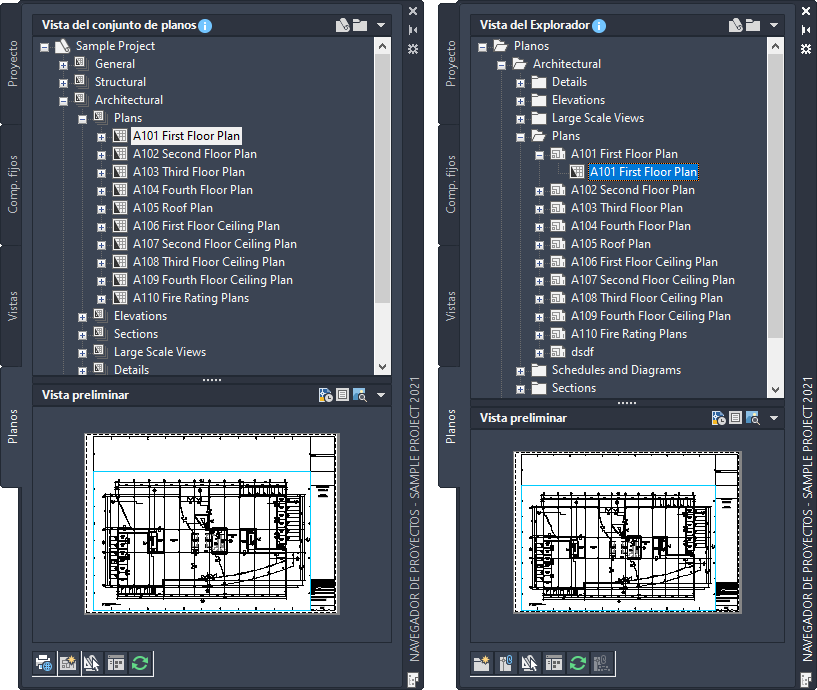 Ficha Planos con la Vista del conjunto de planos del proyecto (izquierda) y la Vista del Explorador (derecha)