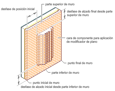 | especificar la altura inicial del modificador de muro | escriba un valor para Desfase de alzado inicial y especifique si el desfase se produce desde la parte superior o inferior del muro, la altura base del muro o la línea de justificación del muro. |